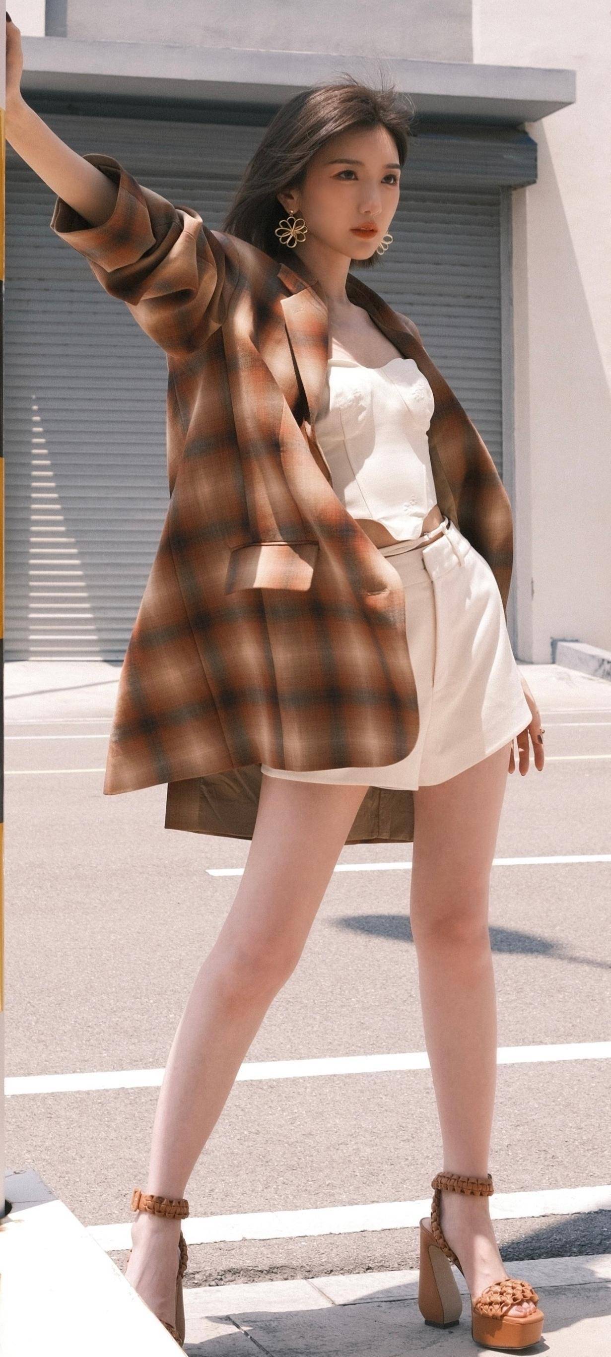 毛晓彤以格子外套搭配短裤的造型,可谓是时尚感拉满。
